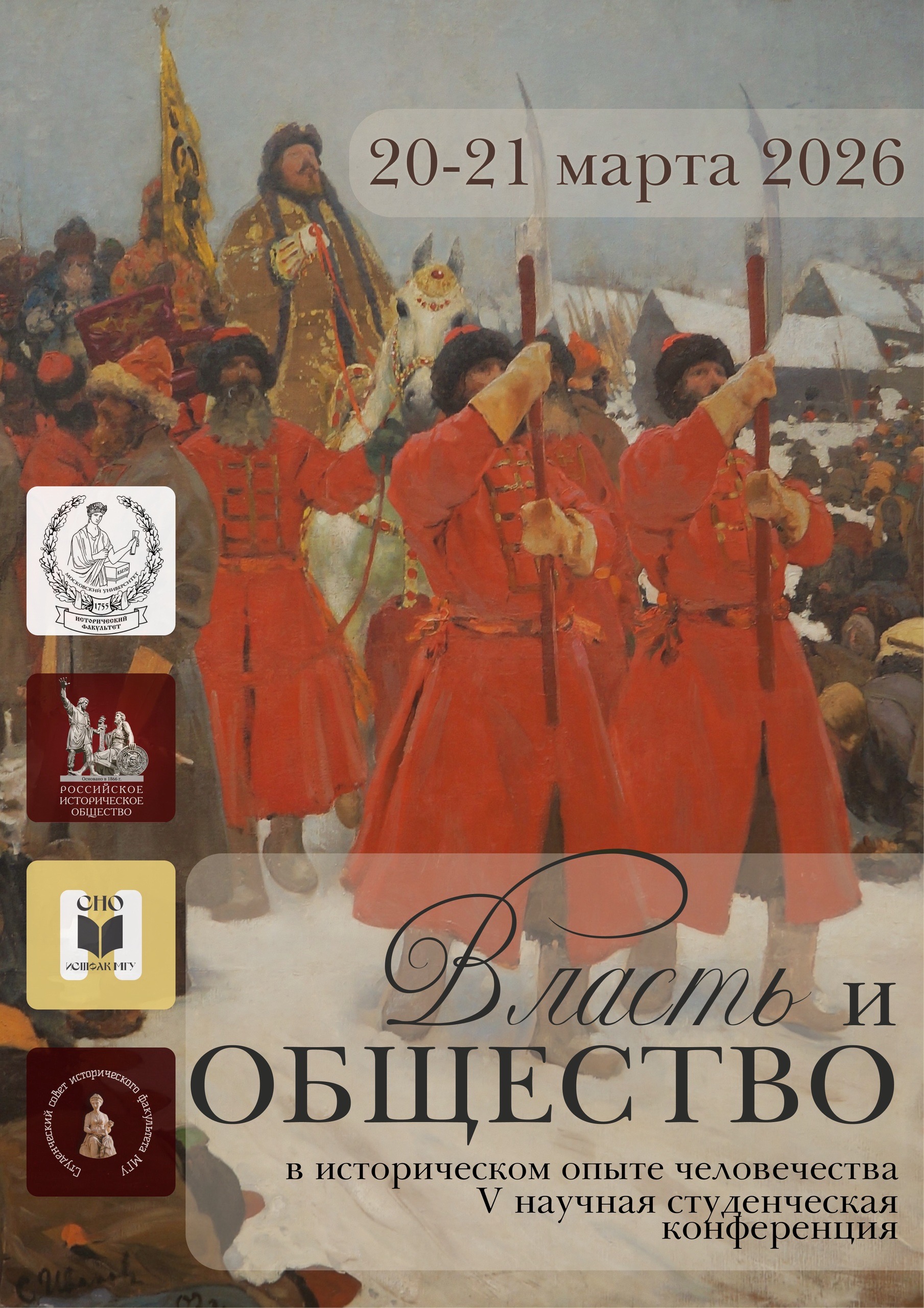 Студенческое научное общество, Студенческий совет исторического факультета Московского государственного университета имени М.В. Ломоносова и Молодёжный клуб Российского исторического общества приглашают принять участие в V международной междисциплинарной научной конференции студентов, аспирантов и молодых учёных «Власть и общество в историческом опыте человечества». Конференция состоится на базе исторического факультета МГУ имени М.В. Ломоносова в очном формате (с возможностью дистанционного участия) 20 – 21 марта 2026 года.